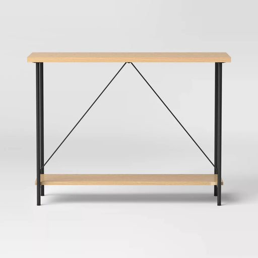 Sun West ClearanceConsole table in natural wood tone Black metal frame Wooden top Wooden lower shelf 29.7in H x 40in W x 15in D