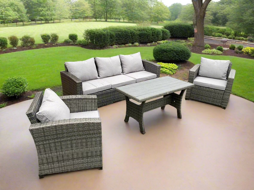 Sun West OutdoorGrey wicker patio outdoor 4Pc set with 3 seater - sofa and table and 2 armchairs - gray cushions seat 5 Available assembled or in box. Pick up at...