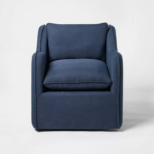 Sun West ClearanceBlue slipcover chair Chair with curved, high armrests Matching blue seat and back cushions Upholstered in polyester-blend fabric ...
