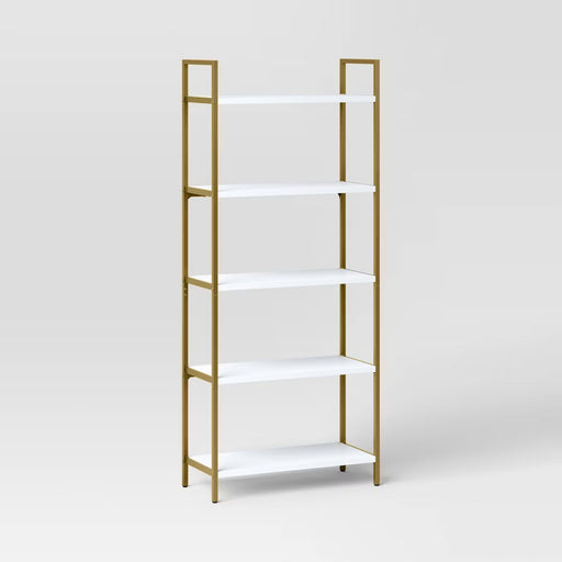 Ladder bookshelf Black metal frame with brown wood-finish shelves 5 open shelves 72in height
