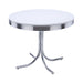 Bring vintage charm into your dining space with this retro-style oval dining table. Featuring a smooth white top with a chrome-rimmed edge, it channels classic mid-century diner vibes. The curvaceous chrome metal legs add stylish stability, while the easy-to-clean surface ensures practical everyday use. Perfect for creating a nostalgic, fun atmosphere in kitchens or casual dining areas. Key Features: • Retro-inspired oval dining table with iconic mid-century styling • Smooth white tabletop with chrome-rimmed apron for vintage flair • Curved electroplated chrome legs provide both support and retro character • Durable engineered wood top with easy-care paper laminate finish • Perfect for casual dining rooms, kitchen nooks, or 1950s-style interiors • Pairs effortlessly with chrome-framed chairs in red, black, or white tones