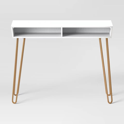 Gorgeous writing desk with built-in storage Features beautiful, warm walnut laminate finish Four brass-finish metal legs Two open co...