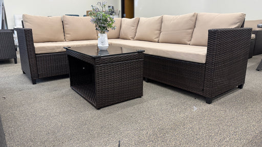 Brown Wicker Patio Outdoor Sectional with Beige Cushions and Tempered Glass table