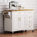 This classic and elegant kitchen island is made of sturdy and environmentally friendly MDF, with a painted exterior and an oak veneer tabletop. The raised texture and gold handles add a sense of luxury. It comes with 1 large drawer and 4 small drawers for easy classification and storage. There are towel racks and spice racks on both sides, and the height-adjustable shelves inside can accommodate items of different sizes. The drop-down board on the top can be expanded or folded according to needs, and can be flexibly adapted to the space. The bottom is equipped with five 360° universal wheels, two of which can be locked for easy movement or fixation. It is both beautiful and practical, and is an ideal choice for the kitchen.